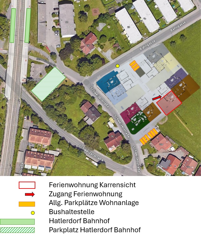 Eine frei verfügbare Anzahl von 9 Prakplätzen für Wohnungsmieter im Aussenbereich der Wohnanlage, ist kostenlos verfügbar. Diese Parkplätze können nicht reserviert werden. Falls keine Parkplätze verfügbar sind in der Wohnanlage, so kann am Bahnhof Hatlerdorf (gegen Gebür) oder den Zufahrts- und Seitenstrassen geparkt werden.